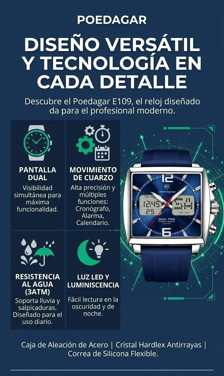 Sí. El RELOJ POEDAGAR E109™ cuenta con resistencia al agua de 5 BAR, lo que lo hace apto para uso diario, lluvia, salpicaduras y lavado de manos. No se recomienda para buceo profundo o sauna